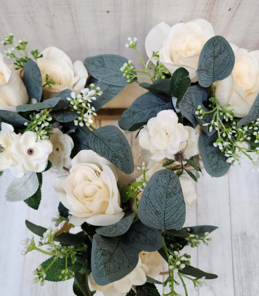 (1) faux rose and eucalyptus greenery arrangement (includes mini & full size roses).