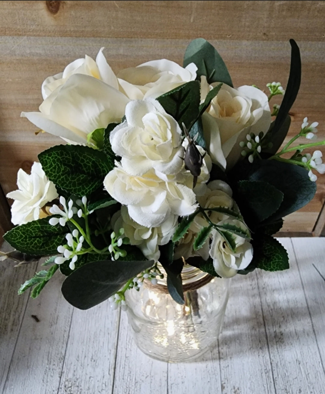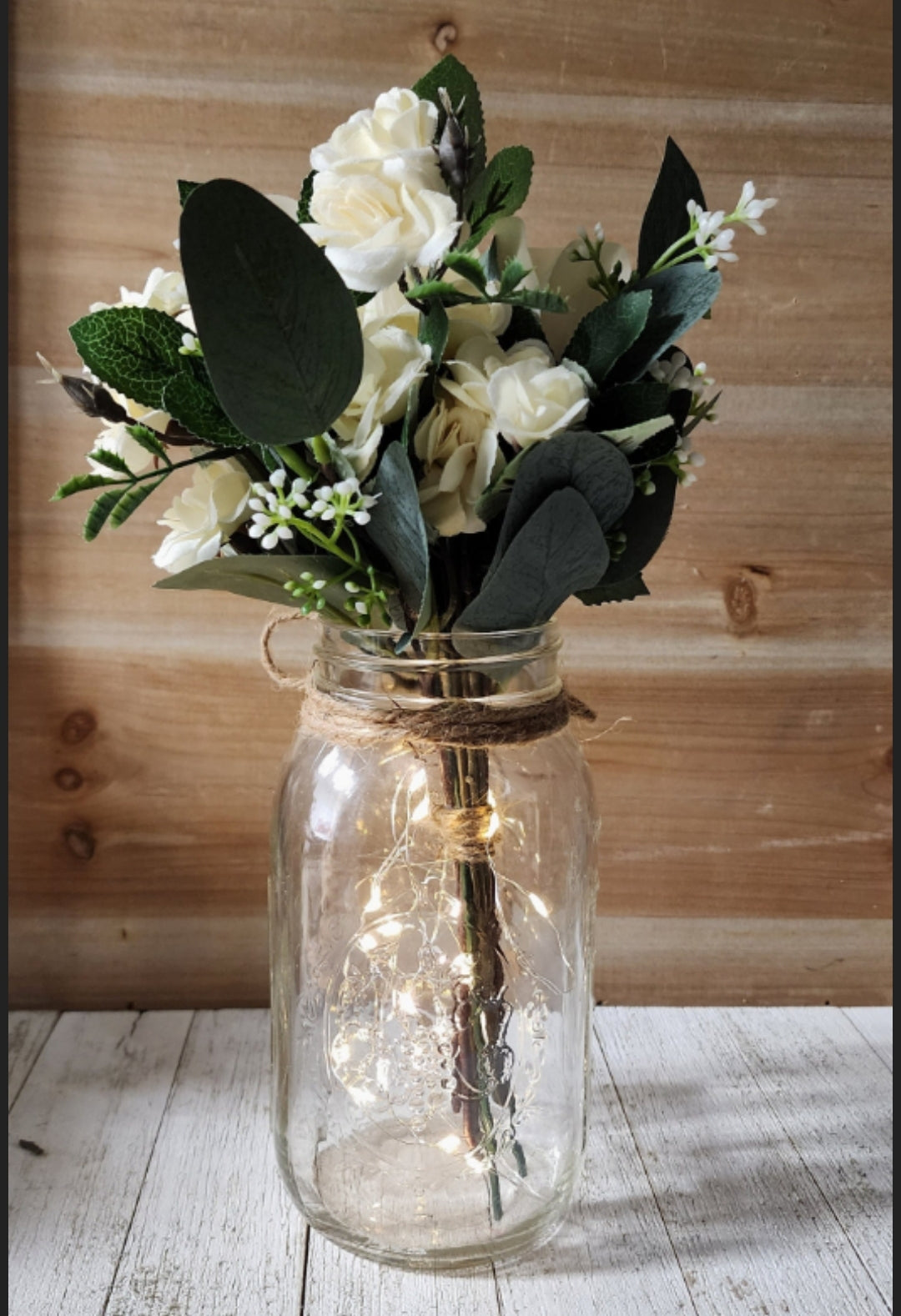 These beautiful faux rose quart size mason jar centerpieces are a Glassy Gal original design. Each centerpiece includes one set of warm white LED fairy lights, a jute bow, a deluxe faux greenery arrangement with a mix of ivory full size and mini roses. These centerpieces are very popular for weddings, baby showers, parties, corporate events, holiday events, and any other event that requires table centerpieces. They also look great in any room of your house or office.